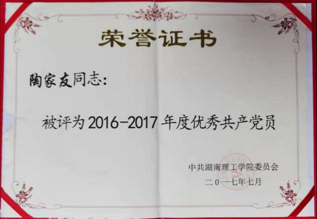 自参加工作以来,他一直从事教学一线工作,工作热情饱满,在学校快速发展的关键步子上贡献了力量。2006年,我校迎来教育部本科教学工作水平评估,为进一步提高学生实践能力,满足学生发展需求,我院的大学物理实验室、专业实验室全部无节/假日开放,时间从上午8点持续到晚上10点。作为同时肩负公共实验和专业实验教学任务的老师,陶家友同志无条件接受工作安排,在完成理论课教学任务之余,顶着高温酷暑,在实验室之间连轴转,和学生一起探讨实验方法,指导学生进行实验操作训练,汗水湿透了衣服结成一层层的盐渍,经常一天换3套衣服。最终学生的实验操作顺利通过了教育部评估专家组的随机抽检现场考核。2017年,我校迎来了教育部本科教学审核评估。此时陶家友同志担任学院的院长助理,在李宏民院长、罗文华书记的领导下,组织全院骨干力量,对审核评估内容6大基本审核项目、24个审核要素、67个审核要点逐一进行分析、讨论,将整体任务分解到个人,积极推动并负责最后迎评材料的整理汇总。这一任务责任重大,工作强度高、持续时间长,几乎没有节假日休息,长期的高负荷工作使原本健康的身体变差,头发甚至出现了多处斑脱。如果没有坚定的理想信念,没有以校为家的主人翁精神,难以保证高负荷下的工作质量,难以经受学校发展关键时期的任务考验。陶家友同志在工作上表现出较强的组织观念和大局意识,以及较好的组织能力和综合协调能力,出色地完成了学院安排的工作任务,为学院的发展做出了较为突出的贡献,也因此多次获得学校表彰,被评为2006年“实验室先进个人”,2008年、2009年、2016年、2019年、2020年“先进工作者”,2017年、2019年“优秀共产党员”。