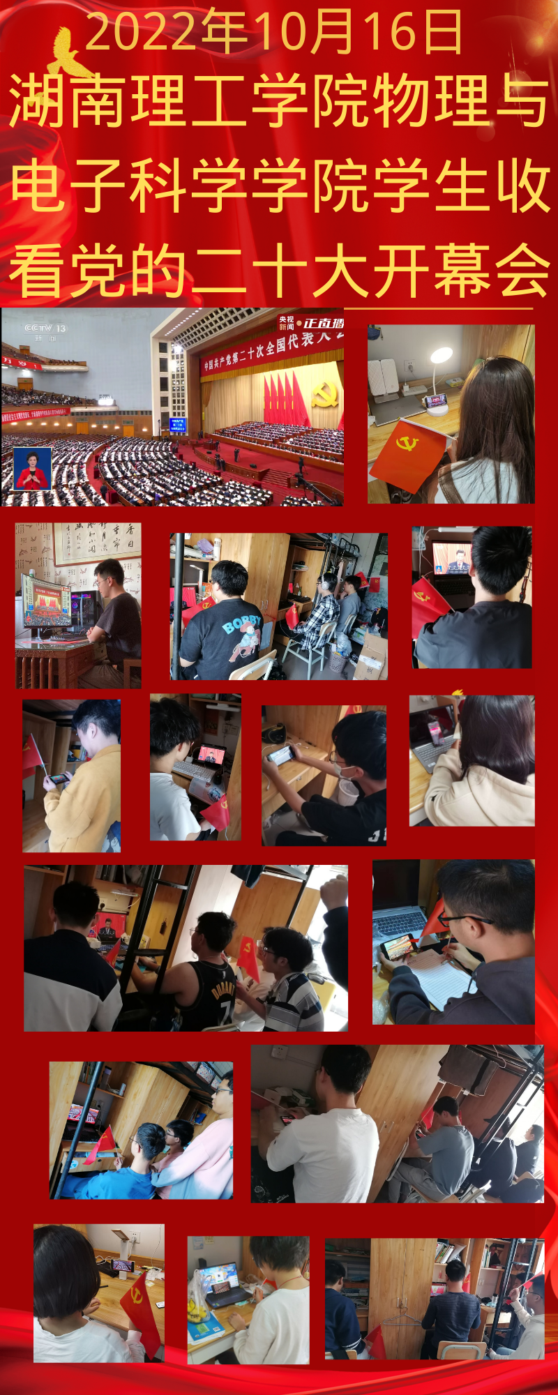 物电学子密切关注党的二十大召开,他们或在教室,或在宿舍集中收看,或组织腾讯会议线上收看开幕会。他们手持党旗,热烈祝贺党的二十大召开。同学们认真聆听习近平总书记的报告,深感作为新时代青年,生正逢时,使命重大,要努力学习,报效祖国!