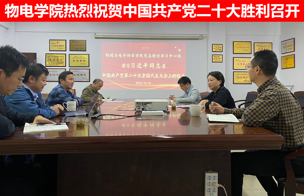 10月16日上午,中国共产党第二十次全国代表大会开幕,物理与电子科学学院党委组织师生收看。院党委成员在6205会议室集中收看。