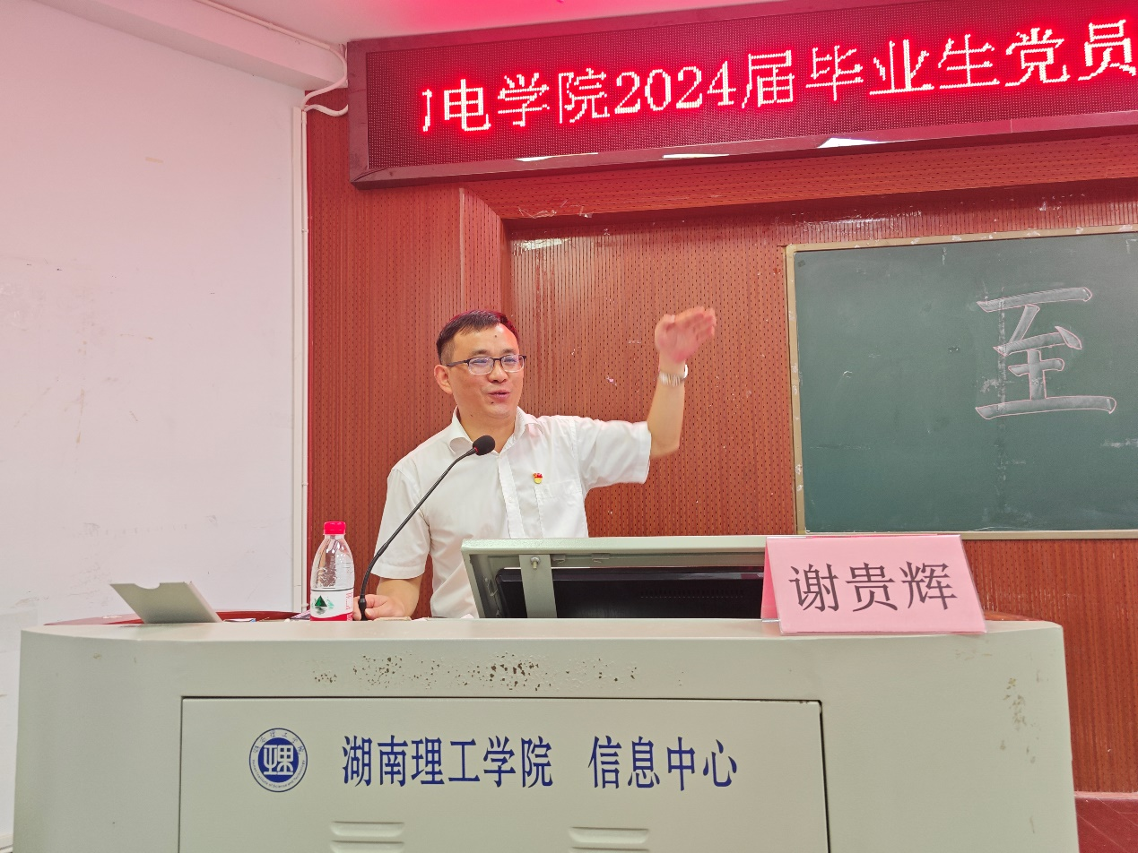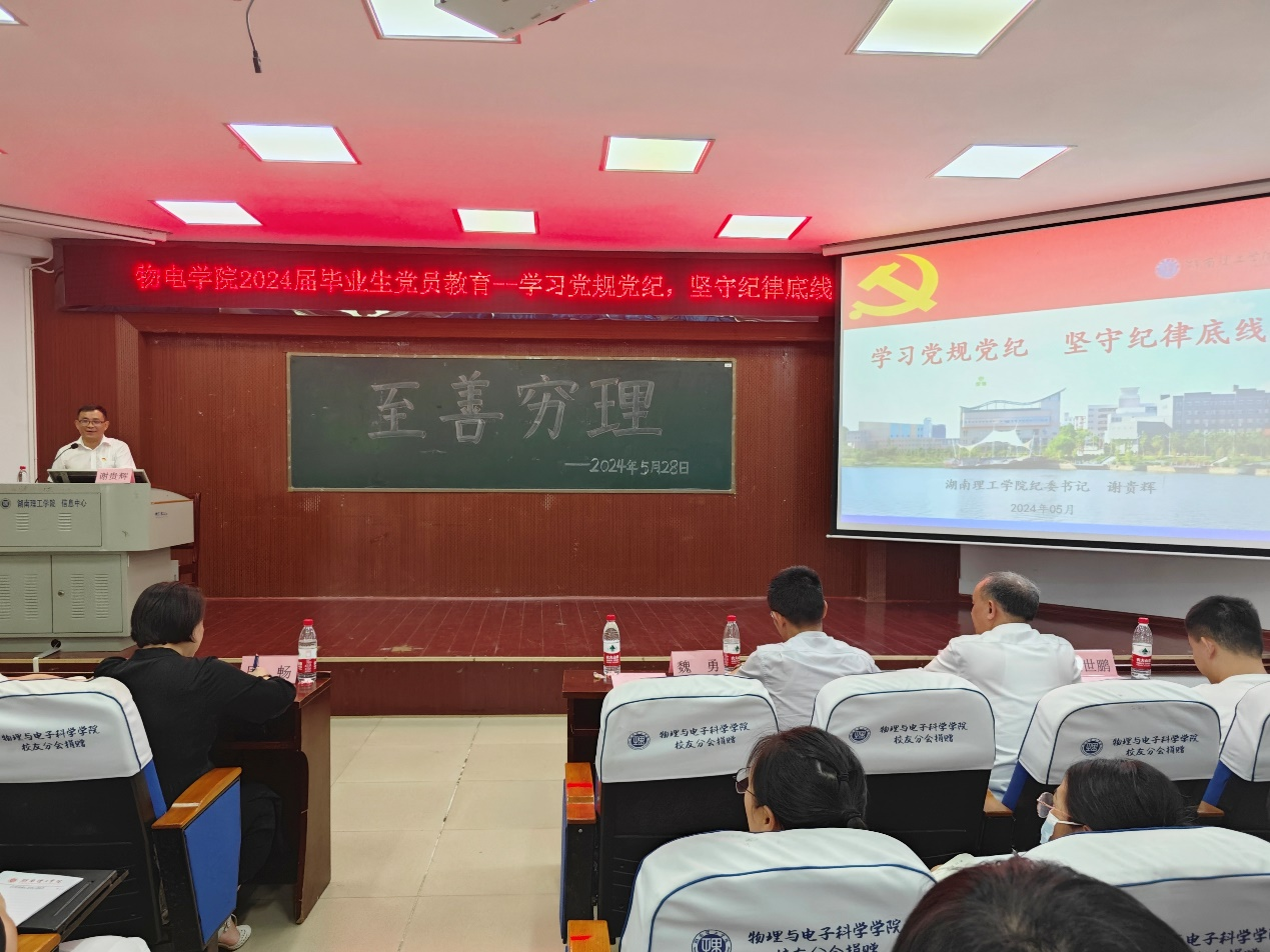 为深入学习贯彻习近平总书记关于党纪学习教育的重要讲话精神,扎实开展党纪学习教育,5月28日下午,物电学院党委邀请校党委委员、纪委书记谢贵辉为学院师生讲授“学习党规党纪,坚守纪律底线”的专题党课。学院党委委员、师生党员、入党积极分子100余人参加,院党委书记周畅主持。