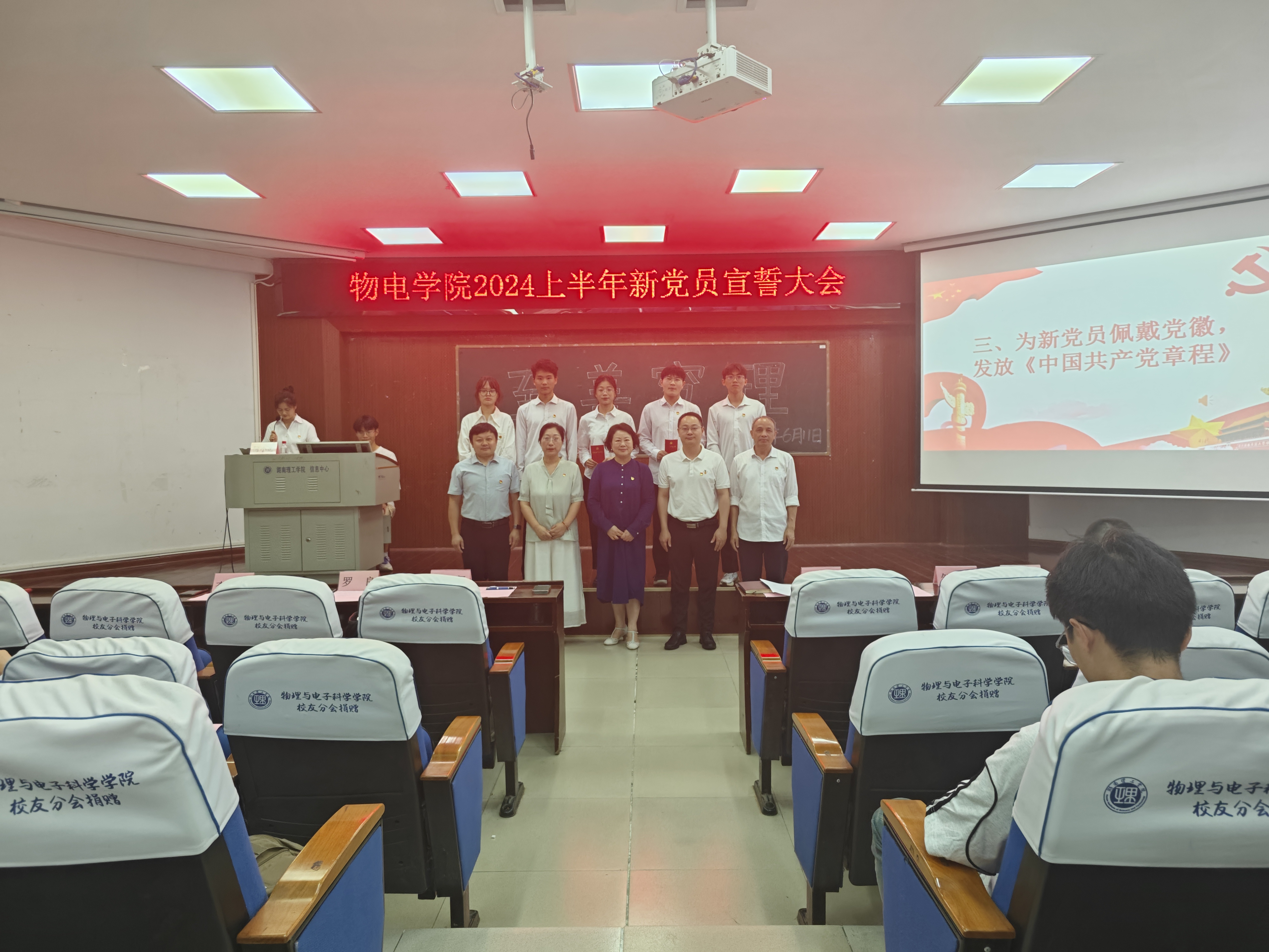 校园网讯 6月11日下午,物电学院2024年上半年新党员宣誓仪式在6号楼学术报告厅举行。学院党委成员周畅、石红芳、李科敏、邹志军、罗良及学生第二党支部书记姚世鹏出席,全体学生党员、入党积极分子代表参加,学生第一党支部书记何小娅主持。