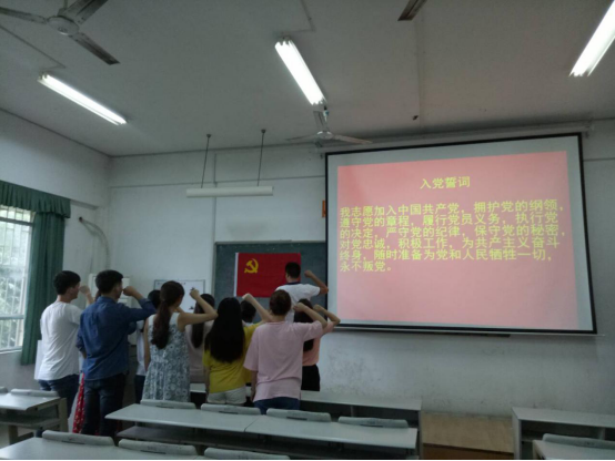 会上,张老师代表学校党委组织部宣读了学校党委《接收预备党员批复》和《中共预备党员转为正式党员批复》。在张老师领誓下,全体党员面对党旗庄严宣誓。