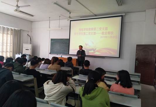 活动伊始,物电学院院长李宏民向在座学生党员强调了就业帮扶及教工党员和学生党员应共同携手实现就业帮扶的重要意义。紧接着,物电学院党总支副书记张陈武上台向同学们分析了目前许多公司对物电学院的招聘情况,并向同学们讲解了目前物电学子的应聘形势及状况。