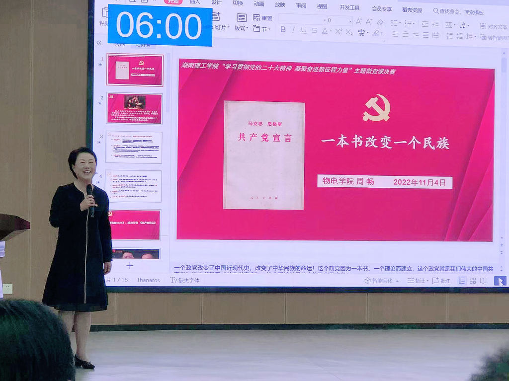 我院党委书记周畅以“《共产党宣言》:一本书改变一个民族”为题,讲述了《共产党宣言》和马克思主义作为中国共产党的建党思想和理论指导,在百年党史取得历史性成就的作用和意义。并将物电学院党委如何推动《共产党宣言》和马克思主义理论原著在物电学子中学习与传播进行了介绍。最终,周畅的党课以94.48分的成绩获得一等奖第一名。
