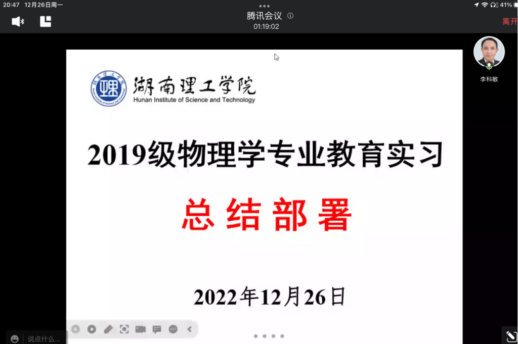 20221226日,物电学院通过腾讯会议部署了2019级物理学专业教育实习总结”工作,全体实习生和指导教师参加。院党委副书记李科敏教授主持