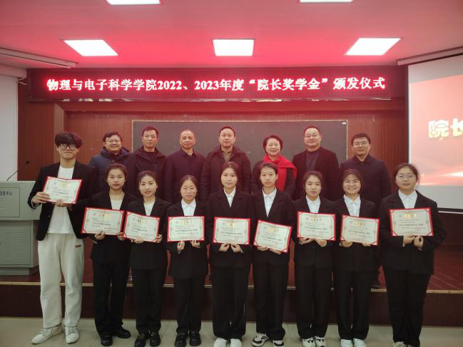 仪式在庄严的国歌中拉开序幕。副院长魏勇宣读《物理与电子科学学院院长奖学金评选细则》,院党委副书记李科敏宣读《物电学院关于表彰2022、2023年度院长奖学金获得者的决定》,授予物理学专业2020-2BS班李沁同学“2022年度个人院长奖学金”,授予物理学专业2020-1BS班杨诗怡、光电信息科学与工程专业2021-1BF班孔鑫两位同学“2023年度院长奖学金(个人)”,授予物理学专业2023-2BS班廖艳虹、张雅卉、王秋怡、方芳、李敏佳、侯心怡等六位同学“2023年度院长奖学金(团体)”荣誉称号,并分别授予奖金(个人)3000元和(团队)4000元,表彰他们在专业学习、勇于创新、敢于实践、关心集体、奉献社会等方面做出的突出贡献。