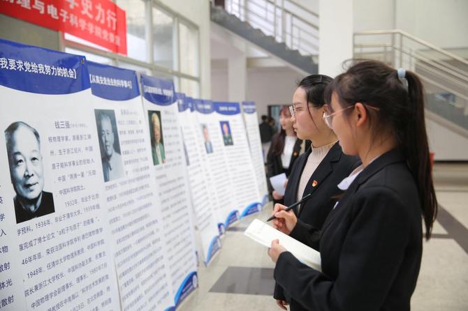 (物理与电子科学学院组织开展的科学家精神宣传展吸引了广大学生前来观展。)