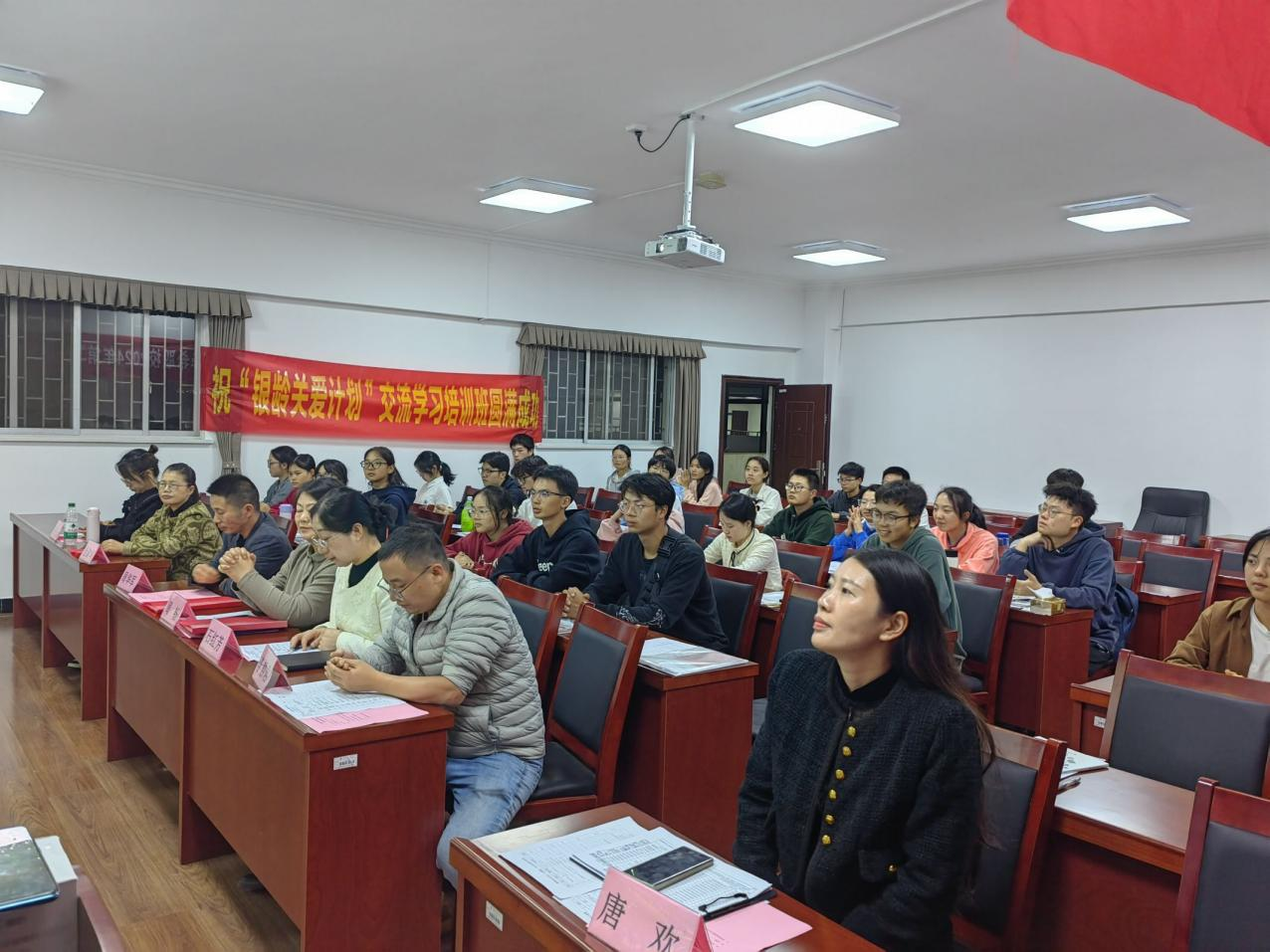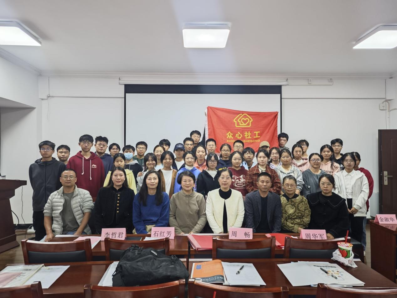 岳阳市众心社会工作服务中心理事长金淑华从志愿服务、创新创业精神、创业与志愿能力三个方面介绍了本次训班的目的,希望同学们能够积极参与讨论与实践活动中,学有所成。