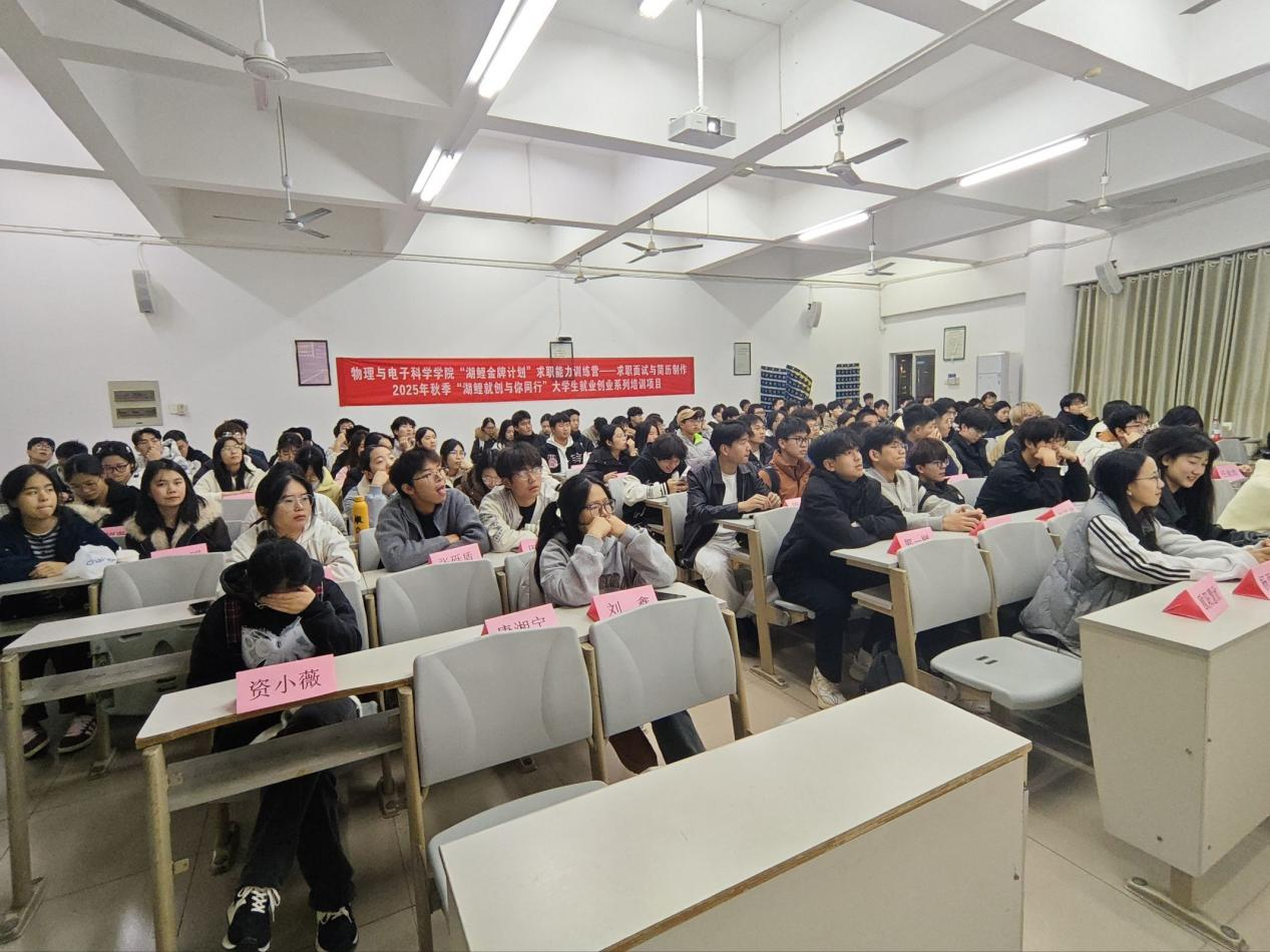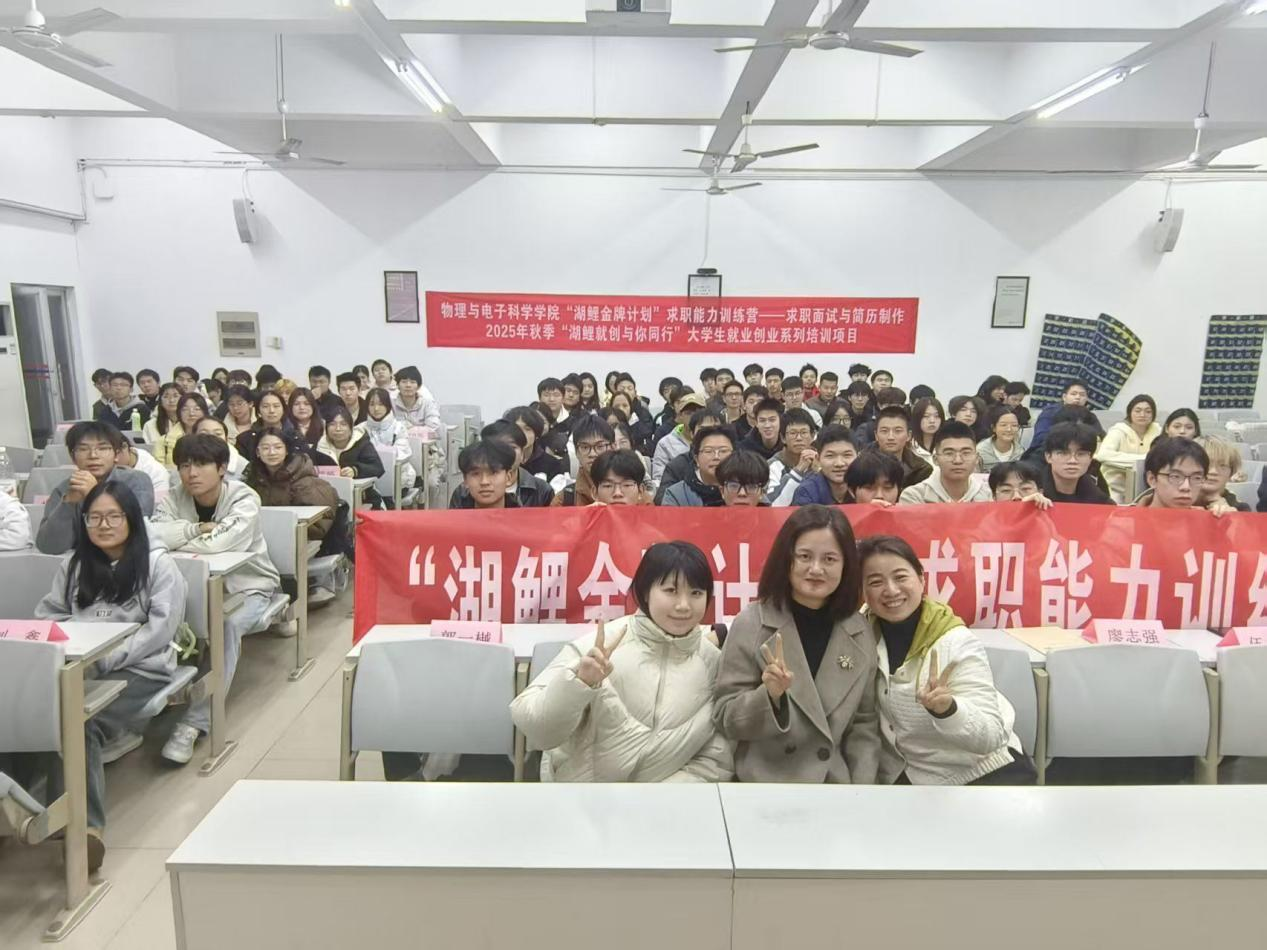 11月25日晚,物电学院在6T1教室组织开展“湖鲤金牌计划”求职能力训练营活动,此次活动的主题为“求职面试与简历制作”,何小娅老师到场组织。